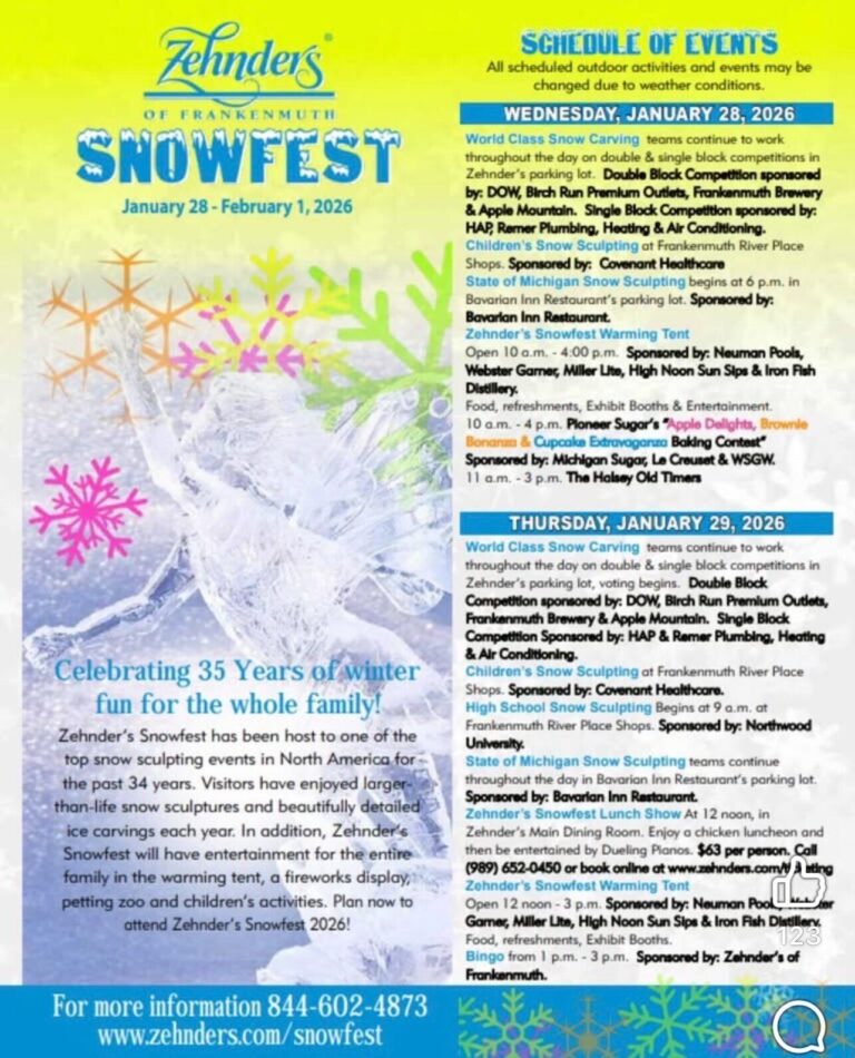 Wednesday-Sunday | 01.28.26-02.01.26 – Join us in the Warming Tent at Zehnders of Frankenmuth Snowfest! For full schedule and information click here