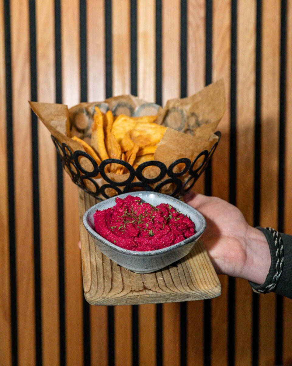 Purple Beets, Chickpeas, tahini, lemon juice, garlic, and olive oil. Served with warm pita points. 10