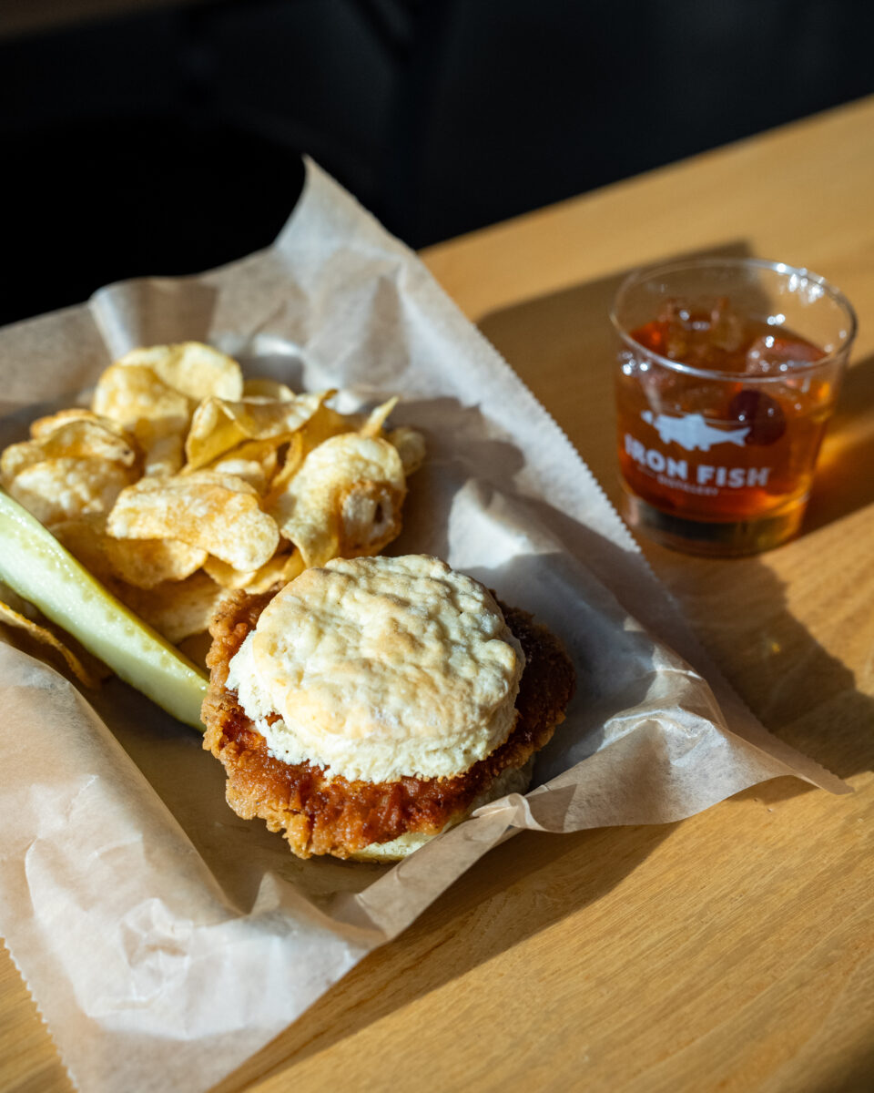 A buttery warm biscuit, topped with fried chicken, and house made hot honey, served with great lakes potato chips. 15 add bacon +4