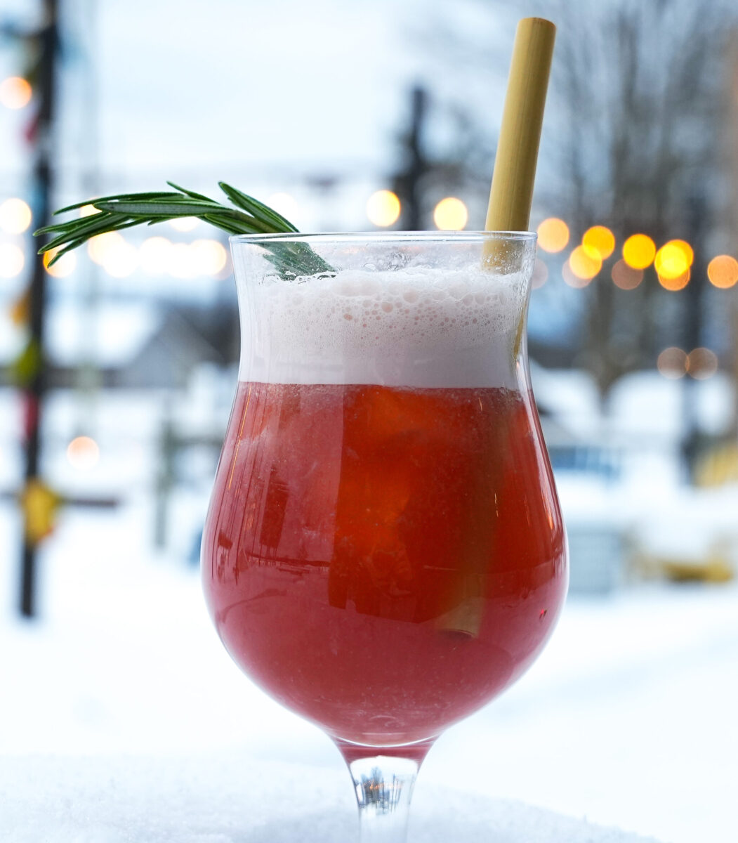Rosemary Infused Soft Parade Vodka, Cinnamon and Saskatoon Simple Syrup, Lemon Juice, Cranberry Juice, and Coconut Cream. 14